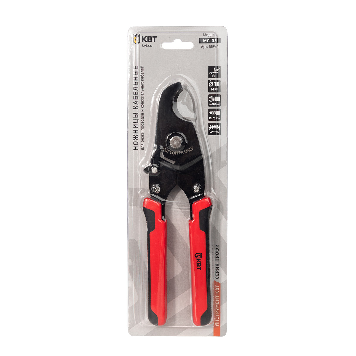 Ножницы для резки проводов и коаксиальных кабелей MS-03 КВТ 55941 серия ПРОФИ способны резать провода диаметром до 18 миллиметров, телефонные кабели до 100 пар и коаксиальные кабели типов RG-9 и RG-174. Лезвия выполнены в форме серпа и изготовлены из закаленной стали, что обеспечивает высокую прочность и долговечность.
