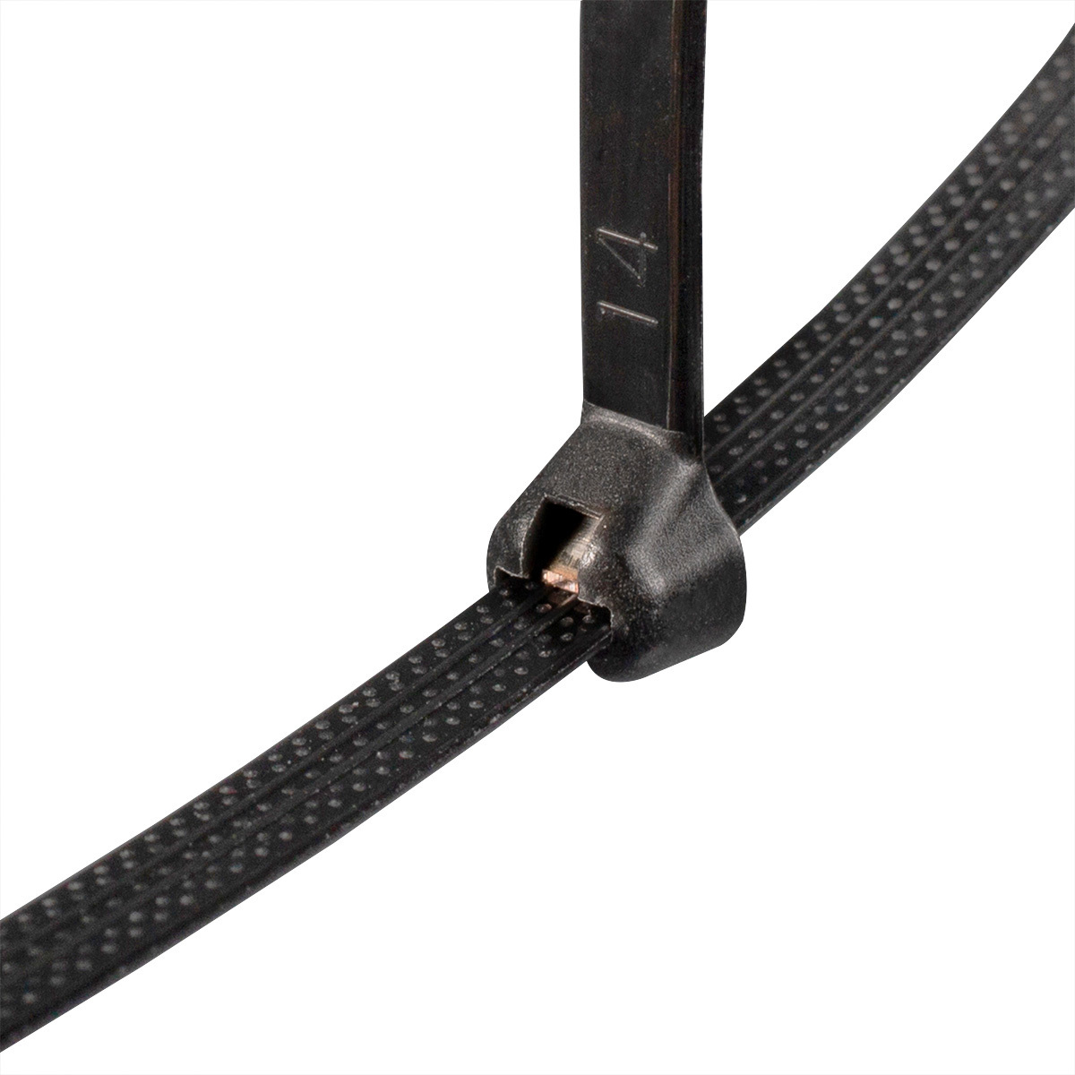 Устройство замка кабельной стяжки повышенной прочности представляет собой нейлоновую головку со встроенной металлической пластиной из нержавеющей стали — зубом. Нержавеющая сталь замка обеспечивает высокую прочность и износостойкость. Плавный переход от головки к ленте предотвращает разрывы. Внутренняя поверхность ленты с рельефными выступами надежно фиксирует конструкцию, исключая проскальзывание. Хомуты выдерживают температуры от -40°C до +85°C и монтируются при температуре от 0°C до +60°C. Прочность и гибкость зубьев сохраняются даже при низких температурах и высокой влажности. Замок односторонний и неразъемный.